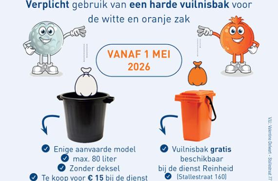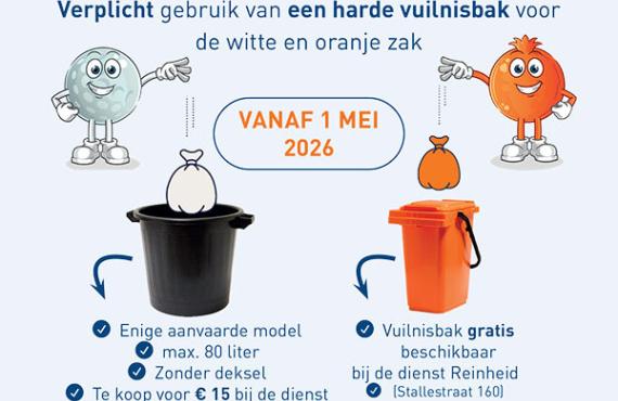 Vanaf 1 mei 2026 moeten de witte en oranje vuilniszakken verplicht in een stevige vuilnisbak worden gedaan om te voorkomen dat ze op straat…